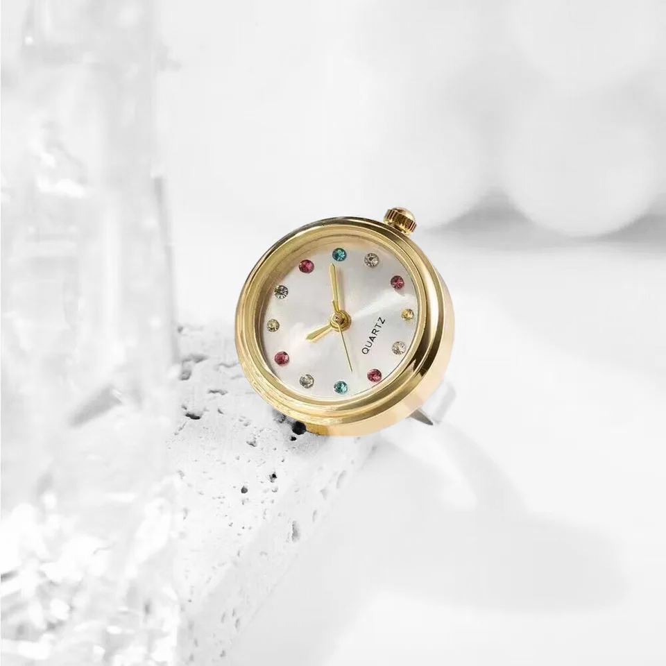 Een sprankelend ringhorloge met gekleurde strassteentjes. Het is gemaakt van stainless steel en heeft een verstelbare ringband zodat het om elke vinger past. Verkrijgbaar in 3 kleuren.