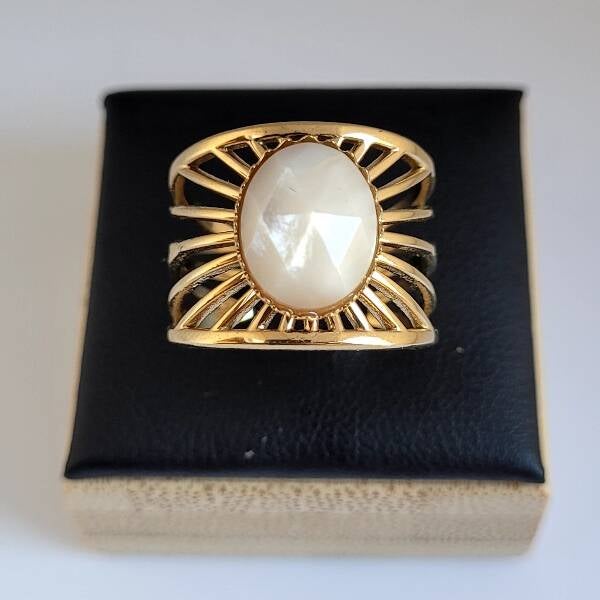 Yay! Nieuw in de collectie ringen. Deze prachtige gouden/zilveren brede ring in de vorm van een Mandela met prachtige witte steen in het midden! De ring is verstelbaar in maat, ideaal! De ring is perfect te combineren met meerdere subtiele gouden sieraden en is gemaakt van Stainless steel in combinatie met steen.
