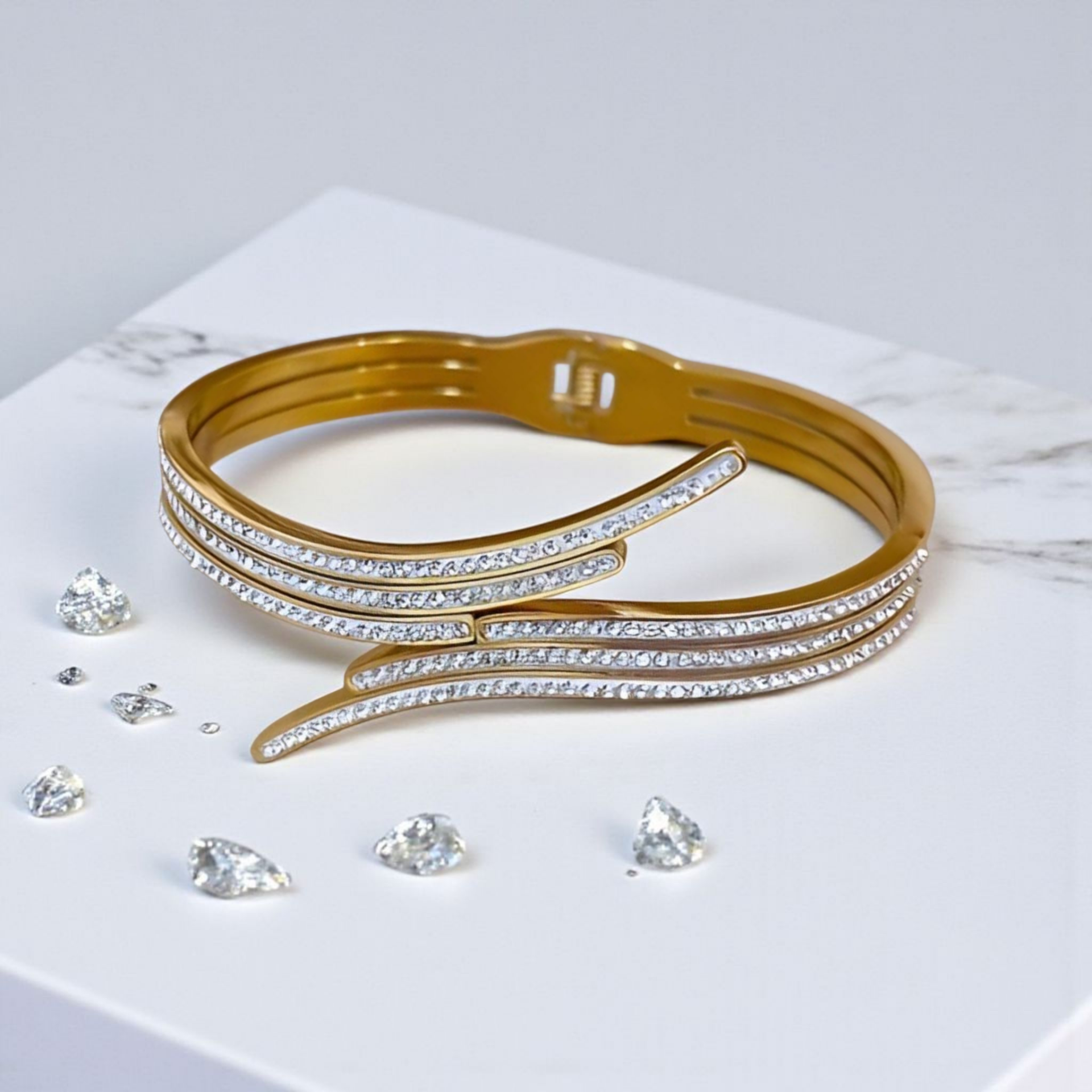 Mooi stainless steel armband, rijkelijk voorzien van fijne strass steentjes. Een echte eyecatcher die je outfit helemaal af maakt. De omtrek van de armband is ruim 19 cm.