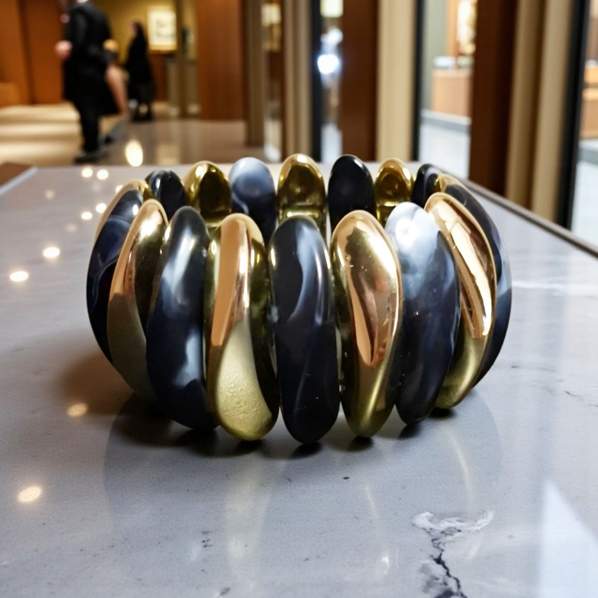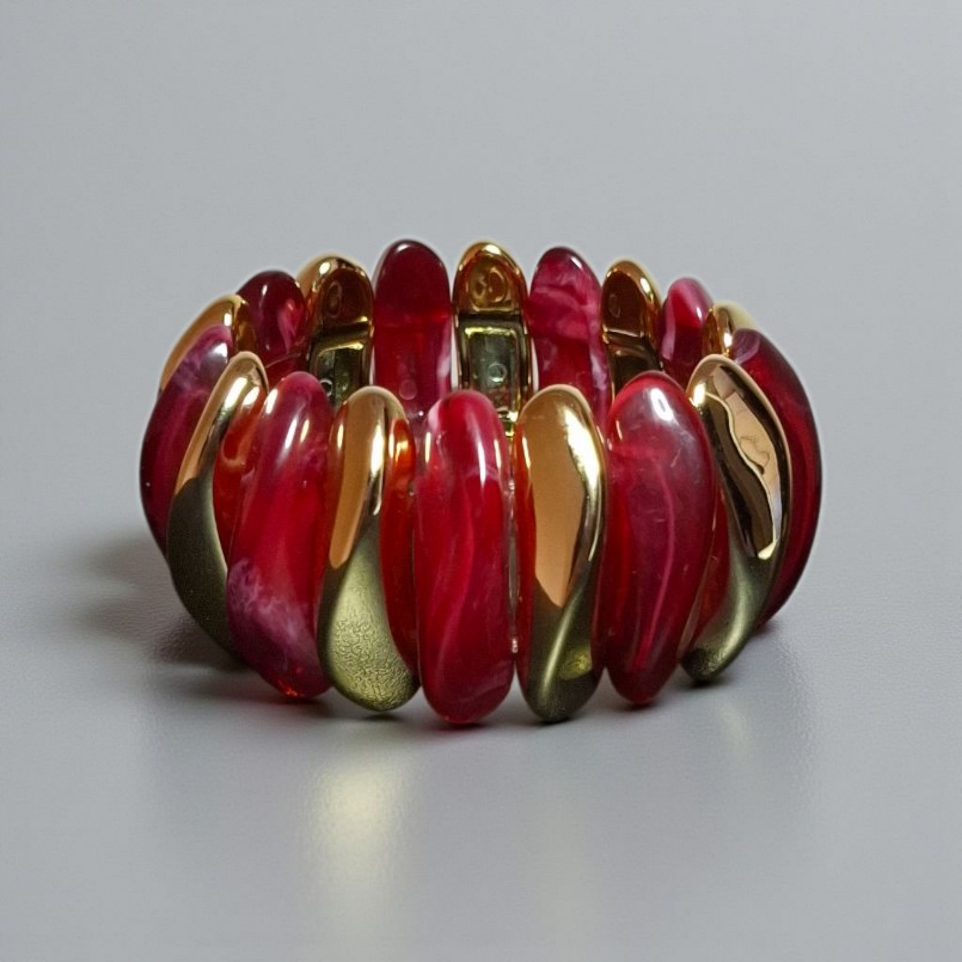 Leuke statement armband gemaakt van acryl schakels, geregen op elastiek. De schakels zijn gemarmerd design, dus elke armband is uniek. De armband is 18cm en 4cm breed.